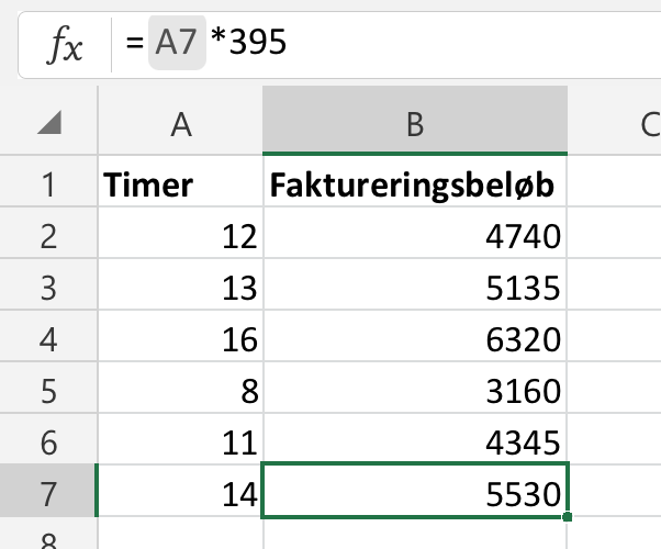 Men i mange tilfælde vil man have data/tal, som står i regnearket, som man skal bruge i sin udregning. Fx en liste med timer, som man ønsker at omregne til et faktureringsbeløb. Formlen laves ved, at stille sig i den celle, man ønsker resultate i, og starte med at skrive =, her efter laver man det man kalder en reference, altså peger på den celle, hvorfor man ønsker at hente en værdi. Referencen beskrives som navnet på cellen – A2. Man laver referencen ved at skrive A2, eller ved at klikke med musen på cellen. Her efter skriver man *395 og trykker enter. Nu vises resultatet i cellen.