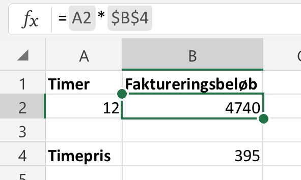 Ved at trykke på F4 kommer der dollartegn frem i referencen, de to dollartegn betyder, at referencen bliver konstant, den ændre sig altså ikke, når vi trækker eller kopiere formlen. Hvis formlen fx kopieres til celle B3 vil A2 referencen ændre sig til B2, men $B$4 ændres ikke. (Se mere om $-tegn her.)