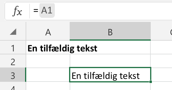 Men formler kan faktisk også bruges til andet end at regne. Hvis man fx vil have hentet den tekst der står i kolonne B og i en cellen, så laver man en formel, som kun har en reference og ikke nogen matematik – derved hentes blot værdien af den celle man har refereret til.
