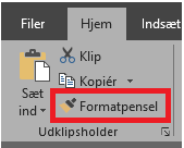 Hvis man endelig har fået lavet den rette formatering af en eller flere celler, kan man genbruge den med formatpenselen. Formatpenslen kopier den formatering du har lavet af en eller flere celler, og indsætter den hvor du trykker.